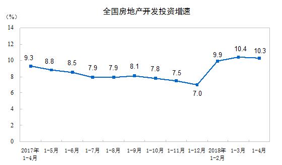 2018年1-4月份,全国房地产开发投资30592亿元,同比名义增长10.3%,增速比1-3月份回落0.1个百分点。其中,住宅投资21331亿元,增长14.2%,增速提高0.9个百分点。住宅投资占房地产开发投资的比重为69.7%。
