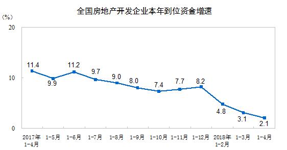 1-4月份,房地产开发企业到位资金48192亿元,同比增长2.1%,增速比1-3月份回落1个百分点。其中,国内贷款8637亿元,下降1.6%;利用外资17亿元,下降77.6%;自筹资金14894亿元,增长4.8%;定金及预收款14987亿元,增长8.3%;个人按揭贷款7148亿元,下降6.7%。