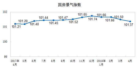 4月份,房地产开发景气指数(简称“国房景气指数”)为101.37,比3月份回落0.13点。