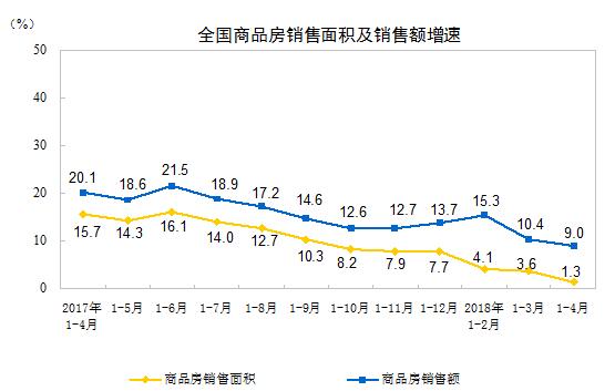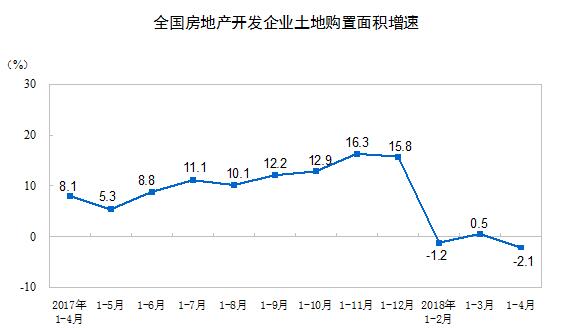 1-4月份,房地产开发企业土地购置面积5412万平方米,同比下降2.1%,1-3月份为增长0.5%;土地成交价款2391亿元,增长13.6%,增速回落6.7个百分点。